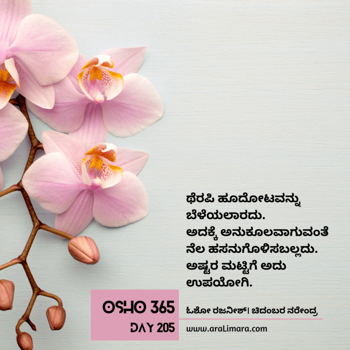 ಥೆರಪಿ ಹೇಳುವುದೇನೆಂದರೆ, ನಿಧಾನವಾಗಿ ನೀವು ನಿಮ್ಮ ಮೇಲಿನ ಭಾರವನ್ನು ಕಡಿಮೆ ಮಾಡಿಕೊಳ್ಳಿ. ಆದರೆ ನಾನು ಹೇಳುವುದು ಥೆರಪಿಯನ್ನು ಮೀರಿದ್ದು, ಆದರೆ ಥೆರಪಿ ಖಂಡಿತ ನಿಮ್ನನ್ನು ತಯಾರುಮಾಡುತ್ತದೆ ~ ಓಶೋ ರಜನೀಶ್; ಕನ್ನಡಕ್ಕೆ: ಚಿದಂಬರ ನರೇಂದ್ರ