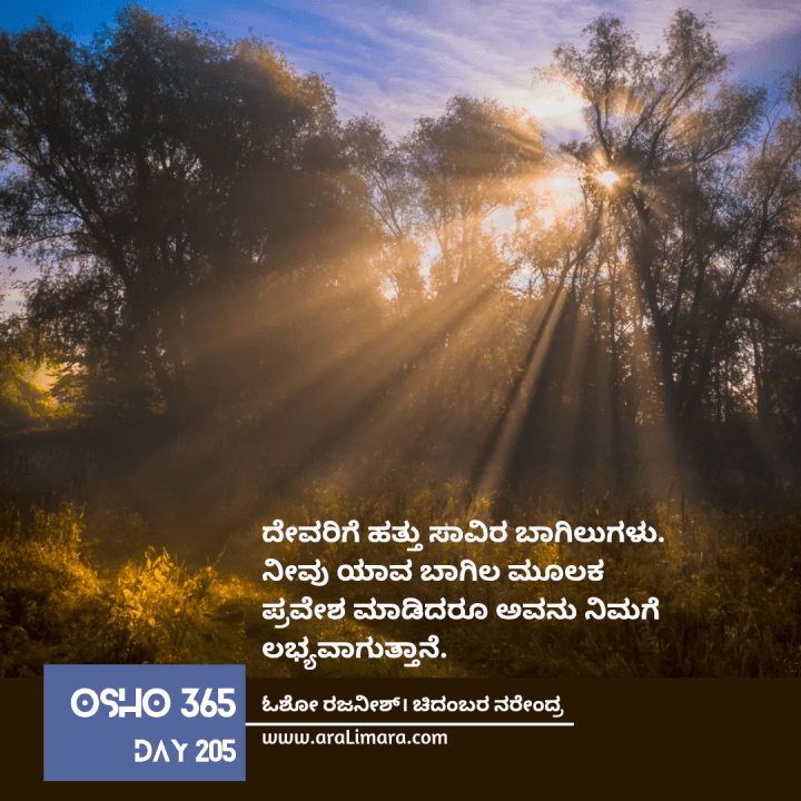 ಅಸ್ತಿತ್ವದೊಂದಿಗೆ ಸಾಧ್ಯವಾದಷ್ಟು ಸಂಪರ್ಕಗಳನ್ನು ಸಾಧಿಸಲು ಶುರುಮಾಡಿ. ಮರದ ಪಕ್ಕ ಕುಳಿತಿರುವಾಗ, ಮರವನ್ನು ಅಪ್ಪಿಕೊಳ್ಳಿ ಮತ್ತು ನೀವು ಮರದೊಂದಿಗೆ ಒಂದಾಗುತ್ತಿರುವ ಅನುಭವವನ್ನ ಫೀಲ್ ಮಾಡಿ. ನೀವು ಈಜುವಾಗ, ಕಣ್ಣು ಮುಚ್ಚಿಕೊಂಡು ನೀವು ನೀರಿನಲ್ಲಿ ಕರಗಿ ಹೋಗುತ್ತಿರುವ ಅನುಭವವನ್ನ ಫೀಲ್ ಮಾಡಿ ; ಅಸ್ತಿತ್ವದೊಂದಿಗೆ ಒಂದಾಗುವಿಕೆ ನಿಮಗೆ ಸಾಧ್ಯವಾಗಲಿ ~ ಓಶೋ ರಜನೀಶ್; ಕನ್ನಡಕ್ಕೆ: ಚಿದಂಬರ ನರೇಂದ್ರ