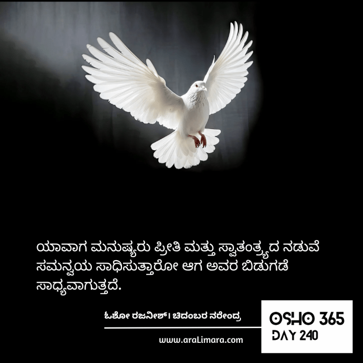 ಒಂದನ್ನು ಆಯ್ಕೆ ಮಾಡಿಕೊಳ್ಳುವುದು ಬಹಳ ಸುಲಭ – ಪ್ರೀತಿಯನ್ನು ಆಯ್ಕೆ ಮಾಡಿಕೊಂಡು ಸ್ವಾತಂತ್ರ್ಯವನ್ನು ಡ್ರಾಪ್ ಮಾಡುವುದು – ಆಗ ಸ್ವಾತಂತ್ರ್ಯ ನಿಮ್ಮನ್ನು ಬೆಂಬಿಡದೇ ಕಾಡುವುದು, ಮತ್ತು ಅದು ನಿಮ್ಮ ಪ್ರೀತಿಯನ್ನು ನಾಶ ಮಾಡುವುದು. ಆಗ ಪ್ರೀತಿ, ಸ್ವಾತಂತ್ರ್ಯಕ್ಕೆ ವಿರುದ್ಧವಾಗಿರುವಂತೆ ತೋರುವುದು , ಪ್ರೀತಿಗೆ ಶತ್ರುವಿನಂತೆ, ಪ್ರೀತಿಗೆ ವಿರೋಧಾತ್ಮಕವೆಂಬಂತೆ. ಸ್ವಾತಂತ್ರ್ಯವನ್ನು ಹೇಗೆ ಬಿಟ್ಟುಬಿಡಲಿಕ್ಕಾಗುತ್ತದೆ? ಸಾಧ್ಯವಿಲ್ಲ, ಪ್ರೀತಿಗಾಗಿ ಕೂಡ. ಸ್ವಾತಂತ್ರ್ಯವಿಲ್ಲದಾಗ ಪ್ರೀತಿಯೂ ನಿಮಗೆ ಬೇಸರ ಮೂಡಿಸುವುದು ಮತ್ತು ಆಗ ನೀವು ಇನ್ನೊಂದು ಅತಿಗೆ ಮೂವ್ ಆಗುತ್ತೀರಿ.