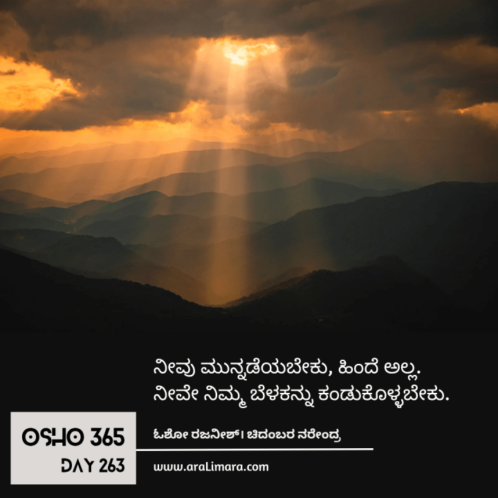 ನೀವು ಮತ್ತೆ ಮತ್ತೆ ಹಿಂತಿರುಗುವ ಬಗ್ಗೆ ಆಲೋಚನೆ ಮಾಡುತ್ತೀರಿ. ಹಿಂತಿರುಗುವ ಪ್ರಶ್ನೆಯೇ ಇಲ್ಲ, ಮತ್ತು ಹಿಂತಿರುಗುವ ಅವಶ್ಯಕತೆಯೂ ಇಲ್ಲ. ನೀವು ಮುನ್ನಡೆಯಬೇಕು, ಹಿಂದೆ ಅಲ್ಲ. ನೀವೇ ನಿಮ್ಮ ಬೆಳಕನ್ನು ಕಂಡುಕೊಳ್ಳಬೇಕು; ಮತ್ತು ಇದು ಸಾಧ್ಯ ಕೂಡ. ಹಿಂತಿರುಗುವ ಯಾವ ಸಾಧ್ಯತೆಯೂ ಇಲ್ಲ, ಹಾಗೇನಾದರೂ ಇದ್ದರೂ, ಆ ಹಳೆಯ ಅನುಭವಗಳು ನಿಮಗೆ ಈಗ ತೃಪ್ತಿಯನ್ನು ತಂದುಕೊಡಲಾರವು. ಆ ಅನುಭವಗಳು ಕೇವಲ ಪುನರಾವರ್ತನೆ, ಇವು ನಿಮಗೆ ಮೊದಲಿನ ಥ್ರಿಲ್ ಕೊಡಲಾರವು. ಮೊದಲು ನಿಮಗೆ ಸಿಕ್ಕ ಥ್ರಿಲ್ ಅವುಗಳ ಹೊಸತನದ ಕಾರಣವಾಗಿ ಸಾಧ್ಯವಾದದ್ದು. ಈಗ ನಿಮಗೆ ಅದೇ ಹಳೆಯ ಅನುಭವ ಗಳು ಆನಂದವನ್ನು ನೀಡಲಾರವು. ಆಗ ನೀವು ಹೇಳುತ್ತೀರಿ, “ ಈ ಅನುಭವ ನನಗೆ ಗೊತ್ತು, ಇದಕ್ಕಿಂತ ಹೆಚ್ಚಿನದೇನಿದೆ? ಇದರಲ್ಲಿ ಹೊಸದೇನಿದೆ?” ಮತ್ತು ಈ ಅನುಭವಗಳು ರಿಪೀಟ್ ಆಗತೊಡಗಿದಂತೆ ನೀವು ಬೋರ್ ಆಗುತ್ತೀರಿ.