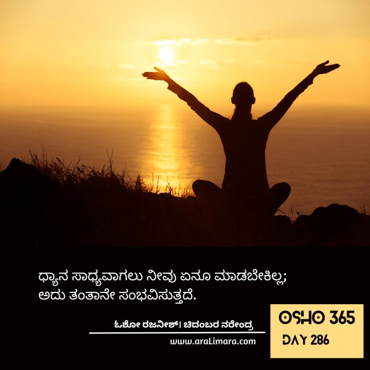 ಸರಿಯಾದ ಧ್ಯಾನಕ್ಕೆ ಯಾವ ಮಿತಿಗಳ ಬಗ್ಗೆಯೂ ಗೊತ್ತಿಲ್ಲ, ನಿಧಾನವಾಗಿ ನಿಧಾನವಾಗಿ ಹರಿವು ಹೆಚ್ಚು ಹೆಚ್ಚು ಪ್ರಜ್ಞೆಯನ್ನು ಒಳಗೊಳ್ಳುತ್ತ ಹೋಗುತ್ತದೆ. ಆಗ ನೀವು ಮಾಡುತ್ತಿರುವುದೆಲ್ಲ ಮೇಲ್ಮೈ ಪಾತಳೆಯ ಮೇಲೆ ಉಳಿದುಕೊಳ್ಳುತ್ತದೆ ; ಆಳದ ಒಳಗೆ ನದಿ ಹರಿಯುತ್ತಲೇ ಇರುತ್ತದೆ. ಮಾರ್ಕೇಟ್ ಲ್ಲಿ ಕೂಡ, ಎಲ್ಲ ಗೋಜಲುಗಳು ಸುತ್ತುವರೆದಿರುವಾಗಲು ಕೂಡ, ನೀವು ಆಳ ಮೌನವನ್ನು ಸಾಧಿಸುವಿರಿ. ಇನ್ನೊಬ್ಬರು ನಿಮ್ಮನ್ನು ಅವಮಾನಿಸುತ್ತಿರುವಾಗಲೂ, ನಿಮ್ಮನ್ನು ರೊಚ್ಚಿಗೆಬ್ಬಿಸುತ್ತಿರುವಾಗಲೂ, ನೀವು ನಿಮ್ಮ ಆಳದಲ್ಲಿ ಸಮಾಧಾನವನ್ನು ಸಾಧಿಸುವಿರಿ; ನೀವು ಗೊಂದಲಕ್ಕೊಳಗಾಗುವುದಿಲ್ಲ. ಸುತ್ತ ಸಾವಿರಾರು distraction ಗಳಿರುವಾಗಲೂ ಕೇಂದ್ರದಲ್ಲಿ ಯಾವುದೂ ವಿಚಲಿತರಾಗುವುದಿಲ್ಲ. ಆದರೆ ಈ ಧ್ಯಾನವನ್ನು ಮ್ಯಾನೇಜ್ ಮಾಡುವುದು ಮೈಂಡ್ ಗೆ ಸಾಧ್ಯವಾಗುವುದಿಲ್ಲ; ಇದು ಹೃದಯಕ್ಕೆ ಮಾತ್ರ ಸಾಧ್ಯವಾಗುವ ಸಂಗತಿ.