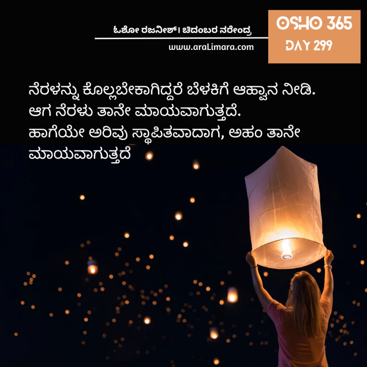 ಇದನ್ನು ಕೇವಲ ಅರ್ಥ ಮಾಡಿಕೊಳ್ಳಬಹುದು. ನಿಮಗೆ ನೆರಳನ್ನು ಕೊಲ್ಲಬೇಕಾಗಿದ್ದರೆ ಬೆಳಕಿಗೆ ಆಹ್ವಾನ ನೀಡಿ. ಆಗ ನೆರಳು ತಾನೇ ಮಾಯವಾಗುತ್ತದೆ. ಹಾಗೆಯೇ ಅರಿವು ಸ್ಥಾಪಿತವಾದಾಗ, ಅಹಂ ತಾನೇ ಮಾಯವಾಗುತ್ತದೆ.