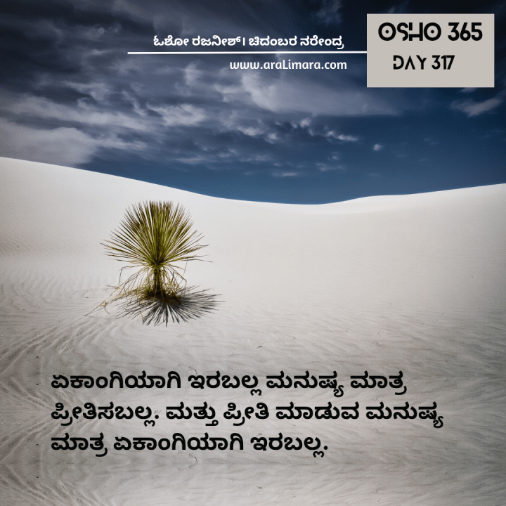 ನಮ್ಮನ್ನು ಏಕಾಂಗಿಯಾಗಿಯೇ ಸೃಷ್ಟಿ ಮಾಡಲಾಗಿದೆ. ಈ ಏಕಾಂಗಿತನವೇ ನಮ್ಮ ಸ್ವಾತಂತ್ರ್ಯ. ಮತ್ತು ಇದು ಪ್ರೀತಿಗೆ ವಿರುದ್ಧವಲ್ಲ. ಬದಲಾಗಿ, ಏಕಾಂಗಿಯಾಗಿರುವ ಮನುಷ್ಯ, ಮತ್ತು ಏಕಾಂಗಿಯಾಗಿ ಹೇಗಿರಬೇಕೆಂದು ಗೊತ್ತಿರುವ ಮನುಷ್ಯ ಪ್ರೀತಿಸಬಲ್ಲ. ಇದು ಪ್ರೀತಿಯ ದ್ವಂದ್ವ : ಏಕಾಂಗಿಯಾಗಿ ಇರಬಲ್ಲ ಮನುಷ್ಯ ಮಾತ್ರ ಪ್ರೀತಿಸಬಲ್ಲ. ಮತ್ತು ಪ್ರೀತಿ ಮಾಡುವ ಮನುಷ್ಯ ಮಾತ್ರ ಏಕಾಂಗಿಯಾಗಿ ಇರಬಲ್ಲ. ಈ ಎರಡೂ ಕೂಡಿಯೇ ಇರುವಂಥವು. ಆದ್ದರಿಂದ, ನಿಮಗೆ ಏಕಾಂಗಿಯಾಗಿರುವುದು ಸಾಧ್ಯವಿಲ್ಲವಾದರೆ ನಿಮಗೆ ಪ್ರೀತಿಸುವುದೂ ಸಾಧ್ಯವಾಗುವುದಿಲ್ಲ. ಆಗ ನಿಮ್ಮ ಪ್ರೀತಿ ಎನ್ನುವ ಸಂಗತಿಗಳೆಲ್ಲ ಕೇವಲ ನಿಮ್ಮಿಂದ ಪಲಾಯನ ಮಾಡಬಲ್ಲ ಸಂಗತಿಗಳು. ಇದು ನಿಜವಾದ ಪ್ರೀತಿ ಅಲ್ಲ, ಇದು ನೈಜವಾದ ಸಂಬಂಧವಲ್ಲ. ಯಾರು ಯಾರೊಂದಿಗೆ ಸಂಬಂಧ ಬೆಳೆಸುವುದು? ನೀವು ಇನ್ನೂ ನಿಮ್ಮ ಜೊತೆಯೇ ಸಂಬಂಧ ಬೆಳೆಸಿಲ್ಲ; ಇನ್ನೊಬ್ಬರ ಜೊತೆ ನೀವು ಹೇಗೆ ಸಂಬಂಧ ಬೆಳೆಸುತ್ತೀರಿ? ಅದ್ದರಿಂದ ಈ ಜಗತ್ತಿನಲ್ಲಿ ಮಿಥ್ಯಾ ಪ್ರೀತಿಯೊಂದು ಅಸ್ತಿತ್ವದಲ್ಲಿದೆ : ನೀವು ನಿಮ್ಮಿಂದ ತಪ್ಪಿಸಿಕೊಳ್ಳಲು ಪ್ರಯತ್ನಿಸುತ್ತಿದ್ದೀರಿ, ಅವನು/ಅವಳು ತನ್ನಿಂದ ತಾನು ತಪ್ಪಿಸುಕೊಳ್ಳುವ ಪ್ರಯತ್ನಲ್ಲಿ, ಆದರೆ ನೀವಿಬ್ಬರೂ ಒಬ್ಬರು ಇನ್ನೊಬ್ಬರಲ್ಲಿ ಶರಣಾಗತಿಯನ್ನು ಬಯಸುತ್ತಿದ್ದೀರಿ. ಇದು ನೀವು ಒಬ್ಬರಿಗೊಬ್ಬರು ಮಾಡಿಕೊಳ್ಳುತ್ತಿರುವ ಮೋಸ. ಏಕಾಂಗಿತನ ನಮ್ಮ ವ್ಯಕ್ತಿತ್ವದ ಮೂಲಭೂತ ಅಂಶ ಎನ್ನುವುದನ್ನ ನಾವು ಮನಗಾಣಬೇಕು. ಮತ್ತು ಈ ಏಕಾಂಗಿತನದ ಮೂಲಕವೇ ಕ್ರಿಯೆಗೆ ಇಳಿಯಬೇಕು. ನಿಮ್ಮ ಪ್ರೀತಿ ಕೂಡ ಈ ನೆಲೆಯಿಂದಲೇ ಕೆಲಸ ಮಾಡಬೇಕು. ಆಗ ನಿಮಗೆ ಪ್ರೀತಿಸುವುದು ಸಾಧ್ಯವಾಗುತ್ತದೆ.