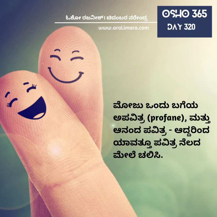 ಹಾಗಾಗಿ ಹೆಚ್ಚು ಆನಂದವನ್ನು ಅನುಭವಿಸಿ, ಸಂತೋಷವನ್ನು ಅನುಭವಿಸಿ, ಅದನ್ನು ಸಂಭ್ರಮಿಸಿ. ಇದರ ಮೂಲಕ ಗ್ರೇಸ್ ಫುಲ್ ಆಗಿ ಚಲಿಸಿ. ಮೋಜು ಒಂದು ಬಗೆಯ ಅಪವಿತ್ರ (profane), ಮತ್ತು ಆನಂದ ಪವಿತ್ರ – ಆದ್ದರಿಂದ ಯಾವತ್ತೂ ಪವಿತ್ರ ನೆಲದ ಮೇಲೆ ಚಲಿಸಿ. ನೀವು ನಗುತ್ತಿರುವುರಾದರೆ, ಅದು ನಿಮ್ಮ ಆನಂದದ ಮೂಲಕ ಹೊರಹೊಮ್ಮಿರಬೇಕೇ ಹೊರತು ಯಾರನ್ನೋ ಯಾವುದನ್ನೋ ಅಪಹಾಸ್ಯ ಮಾಡುವ ಮೂಲಕ ಅಲ್ಲ. ಈ ಅಪಹಾಸ್ಯದ ಒಂದು ಎಳೆ ನಿಮ್ಮೊಳಗೆ ಉಳಿದುಕೊಂಡರೂ ನೀವು ಕೊನೆಗೆ ದುಃಖಿತರಾಗುತ್ತೀರಿ, ಒಂದು ಕೊರಗು ನಿಮ್ಮೊಳಗೆ ಉಳಿದು ಹೋಗುತ್ತದೆ.