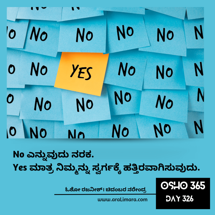 No ನ ಸುಲಭವಾಗಿ ಒಪ್ಪಿಕೊಳ್ಳಬೇಡಿ. ಏಕೆಂದರೆ No ನ ಸುತ್ತ ಬದುಕುವುದು ಸಾಧ್ಯವಿಲ್ಲ. ನೀವು No food ನ ತಿನ್ನಲಾರಿರಿ, No water ನ ಕುಡಿಯಲಾರಿರಿ. No ಒಳಗೆ ಬದುಕುವುದು ಯಾರಿಗೂ ಸಾಧ್ಯವಿಲ್ಲ – ಇಲ್ಲಿ ಕೇವಲ ದುಃಖ ಮತ್ತು ಸಂಕಟಗಳು ಮಾತ್ರ ಸಾಧ್ಯ. No ಎನ್ನುವುದು ನರಕ. ಕೇವಲ Yes ಮಾತ್ರ ನಿಮ್ಮನ್ನು ಸ್ವರ್ಗಕ್ಕೆ ಹತ್ತಿರವಾಗಿಸುವುದು. ಮತ್ತು ಯಾವಾಗ ನಿಮ್ಮ ಇರುವಿಕೆಯ ( being) ಕಾರಣವಾಗಿ ನೈಜ Yes ಹುಟ್ಟಿಕೊಳ್ಳುತ್ತದೆಯೋ ಆಗ ಯಾವುದೂ ಹಿಂದೆ ಬೀಳುವುದಿಲ್ಲ. ಆ Yes ನ ಒಳಗೆ ನೀವು ಪೂರ್ಣಗೊಳ್ಳುತ್ತೀರಿ, ಮತ್ತು ನಿಮ್ಮ ಇಡೀ ಎನರ್ಜಿ ಮೇಲಕ್ಕೆ Yes Yes Yes ಎನ್ನುತ್ತ ಚಲಿಸುತ್ತದೆ.
