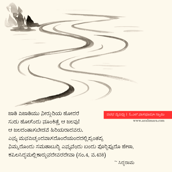 ಯಾವ ಜಾತಿಯವರೇ ಆಗಲಿ ನೀರು ಕುಡಿಯಲೆಂದು ಹೋದರೆ `ನೀನು ಅಯೋಗ್ಯ, ಬೇರೆಯ ಜಾತಿಯವನು ಎಂದು ಅವನನ್ನು ನೂಕುತ್ತದೆಯೇ ನೀರು? ನಿಜವಾದ ಹಿರಿಯರಾದವರು ಹಾಗೆ ಇರಬೇಕಲ್ಲವೇ? ಮನಸ್ಸು ಇಚ್ಛಂದವಾಗದೆ (ಇಬ್ಭಾಗವಾಗದೆ) ಒಂದೇ ಅಂದದಲ್ಲಿ ಇರುವಂಥ ನಿಮ್ಮ ಸಮತಾಗುಣವನ್ನು ನನ್ನ ಮನಸ್ಸು ಎಂದು ಹೊಂದೀತು.
