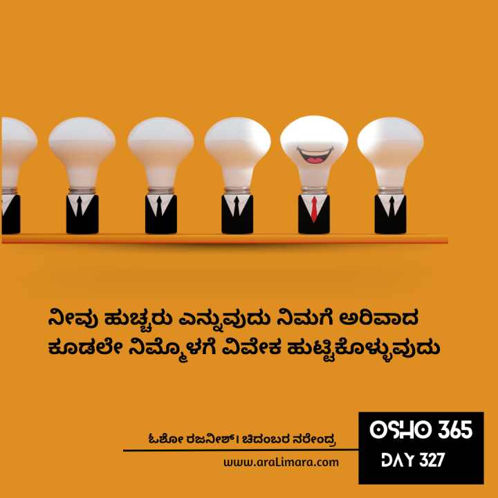 ನೀವು ಹುಚ್ಚರು ಎನ್ನುವುದು ನಿಮಗೆ ಅರಿವಾದ ಕ್ಷಣದಲ್ಲಿಯೇ ನೀವು ಅದನ್ನು ದಾಟಿ ಹೋಗುವಿರಿ; ಆಗಲೇ ನೀವು ವಿವೇಕದೆಡೆ ಮೊದಲ ಹೆಜ್ಜೆಯನ್ನು ಇಟ್ಟಿರುವಿರಿ. ತಾವು ಹುಚ್ಚರು ಎನ್ನುವುದು ಜನರಿಗೆ ಅರಿವಾಗುವುದೇ ಇಲ್ಲ ಆದ್ದರಿಂದಲೇ ಅವರು ಕೊನೆವರೆಗೂ ಹುಚ್ಚರಾಗಿಯೇ ಉಳಿಯುತ್ತಾರೆ. ಜನರಿಗೆ ಹುಚ್ಚುತನದ ಬಗ್ಗೆ ಗೊತ್ತಿಲ್ಲ ಅಷ್ಟೇ ಅಲ್ಲ, ಹಾಗೆಂದು ನೀವು ಅವರಿಗೆ ಗೊತ್ತು ಮಾಡಿಸಲು ಪ್ರಯತ್ನ ಮಾಡಿದಾಗ ಅವರು ತಮ್ಮನ್ನು ಡಿಫೆಂಡ್ ಮಾಡಿಕೊಳ್ಳುತ್ತಾರೆ. ಅವರು ಈ ಬಗ್ಗೆ ನಿಮ್ಮೊಡನೆ ವಾದ ಮಾಡುತ್ತ ಅವರು ಹುಚ್ಚರಲ್ಲ ನೀವು ಹುಚ್ಚರು ಎಂದು ಸಾಧಿಸುತ್ತಾರೆ. ಪ್ರತಿಯೊಬ್ಬರೂ ಹುಚ್ಚರು. ನೀವು ಹುಚ್ಚರು ಎನ್ನುವುದು ನಿಮಗೆ ಅರಿವಾದ ಕೂಡಲೇ ನಿಮ್ಮೊಳಗೆ ವಿವೇಕ ಹುಟ್ಟಿಕೊಳ್ಳುವುದು; ಅದು ಈಗಾಗಲೇ ನಿಮ್ಮ ಹತ್ತಿರದಲ್ಲಿದೆ. ನಿಮ್ಮ ಹುಚ್ಚಿನ ಬಗ್ಗೆ ನಿಮ್ಮೊಳಗೆ ಅರಿವು ಮೂಡಿದ ಕ್ಷಣದಲ್ಲಿಯೇ , ನೀವು ನಿಮ್ಮ ಹುಚ್ಚುತನವನ್ನು ಡ್ರಾಪ್ ಮಾಡುತ್ತೀರಿ.