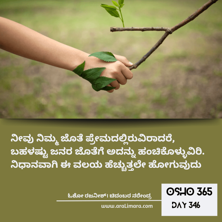 ಒಮ್ಮೆ ನೀವು ನಿಮ್ಮ ಜೊತೆ ಪ್ರೇಮದಲ್ಲಿರುವಿರಾದರೆ, ಆಗ ಬಹಳಷ್ಟು ಜನರ ಜೊತೆಗೆ ಈ ಭಾವವನ್ನು ಹಂಚಿಕೊಳ್ಳುವಿರಿ, ಮತ್ತು ನಿಧಾನವಾಗಿ ಈ ವಲಯ ಹೆಚ್ಚುತ್ತಲೇ ಹೋಗುವುದು. ಒಂದು ದಿನ ಥಟ್ಟನೇ ಈ ವಲಯದಲ್ಲಿ ಇಡೀ ಅಸ್ತಿತ್ವ ಒಳಗೊಂಡಿರುವುದು ನಿಮ್ಮ ಗಮನಕ್ಕೆ ಬರುವುದು. ಈಗ ಪ್ರೇಮ ಯಾವ ನಿರ್ದಿಷ್ಟ ವ್ಯಕ್ತಿಯೊಡನೆ ಮಾತ್ರ ಇರುವ ಸಂಗತಿಯಲ್ಲ. ಈಗ ಪ್ರೇಮ ನಿಮ್ಮ ಮೂಲಕ ಸುಮ್ಮನೇ ಹರಿಯುತ್ತಿದೆ, ಯಾರು ಬೇಕಾದರೂ ಇದನ್ನು ಸ್ವೀಕರಿಸಬಹುದು. ಸ್ವೀಕರಿಸಲು ಯಾರೂ ಇಲ್ಲದಿರುವಾಗಲೂ ಈ ಹರಿವು ಮುಂದುವರೆಯುತ್ತಿರುತ್ತದೆ.