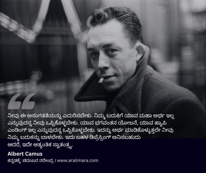 ಯಾವುದನ್ನ ಕಾಮು, ಅಸಂಗತ (absurd) ಎಂದು ಗುರುತಿಸುತ್ತಿದ್ದನೋ, ಯಾವಾಗ ಮನುಷ್ಯ ತನ್ನ ಬದುಕಿನ ಅಂಥ ದುಃಖಭರಿತ ಅರ್ಥಹೀನತೆಯನ್ನು ಎದುರುಗೊಳ್ಳುತ್ತಾನೋ, ಆಗ ಅವನು ಈ ಎರಡು ದಾರಿಗಳಲ್ಲಿ ಒಂದನ್ನು ಆಯ್ಕೆ ಮಾಡಿಕೊಳ್ಳುತ್ತಾನೆ ~ ಚಿದಂಬರ ನರೇಂದ್ರ
