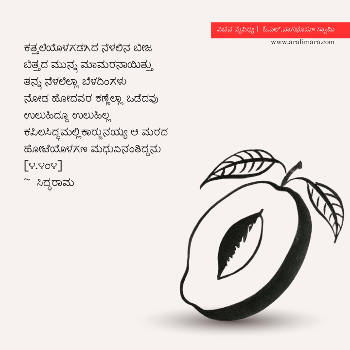ನೆರಳಿನ ಬೀಜ ಕತ್ತಲೆಯಲ್ಲಿ ಅವಿತಿತ್ತು. ಆ ಬೀಜವನ್ನು ಬಿತ್ತುವ ಮೊದಲೇ ಮಾವಿನ ಮರವಾಗಿ ಬೆಳೆದಿತ್ತು. ಆ ಮರದ ನೆರಳು ತಿಂಗಳ ಬೆಳಕು. ಅದನ್ನು ನೋಡಲು ಹೋದವರ ಕಣ್ಣು ಒಡೆದವು. ಮರ್ಮರವಿದ್ದರೂ ಕೇಳುತಿಲ್ಲ. ಕಪಿಲಸಿದ್ಧಮಲ್ಲಿಕಾರ್ಜುನನು ಓಟೆಯೊಳಗಿರುವ ಸಿಹಿಯಂತೆ ಇದ್ದನು.