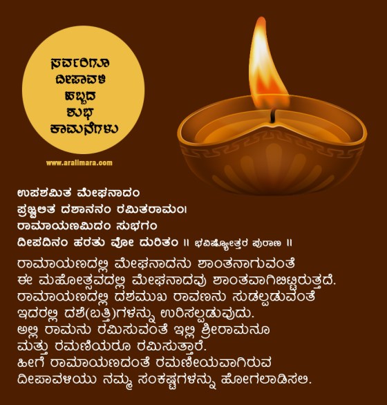 ‘ಅರಳಿಮರ’ದ ಎಲ್ಲ ಓದುಗರಿಗೂ ಮತ್ತು ಬರಹಗಾರರಿಗೂ ‘ಅರಳಿ ಬಳಗ’ದ ವತಿಯಿಂದ ದೀಪಾವಳಿ ಹಬ್ಬದ ಶುಭಾಶಯಗಳು. ದೀಪಾವಳಿ ಹಬ್ಬದ ಹಿನ್ನೆಲೆಯನ್ನು ಸಾರುವ ಆಶಯ ಶ್ಲೋಕ ಇಲ್ಲಿದೆ…