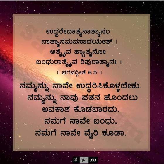 ನಮ್ಮನ್ನು ನಾವೇ ಉದ್ಧರಿಸಿಕೊಳ್ಳಬೇಕು. ನಮಗೆ ನಾವೇ ಪತನ ಹೊಂದಲು ಅವಕಾಶ ಕೊಟ್ಟುಕೊಳ್ಳಬಾರದು. ನಮಗೆ ನಾವೇ ಬಂಧು ನಮಗೆ ನಾವೇ ವೈರಿ ಕೂಡಾ.