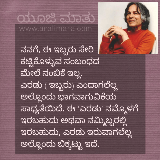 ಎರಡು ( ಇಬ್ಬರು) ಎಂದಾಗಲೆಲ್ಲ ಅಲ್ಲೊಂದು ಭಾಗವಾಗುವಿಕೆಯ ಸಾಧ್ಯತೆಯಿದೆ. ಈ ‘ಎರಡು’ ನಮ್ಮೊಳಗೆ ಇರಬಹುದು ಅಥವಾ ನಮ್ಮಿಬ್ಬರಲ್ಲಿ ಇರಬಹುದು, ಎರಡು ಇರುವಾಗಲೆಲ್ಲ ಅಲ್ಲೊಂದು ಬಿಕ್ಕಟ್ಟು ಇದೆ | ಯೂಜಿ, ಅನುವಾದ : ಚಿದಂಬರ ನರೇಂದ್ರ